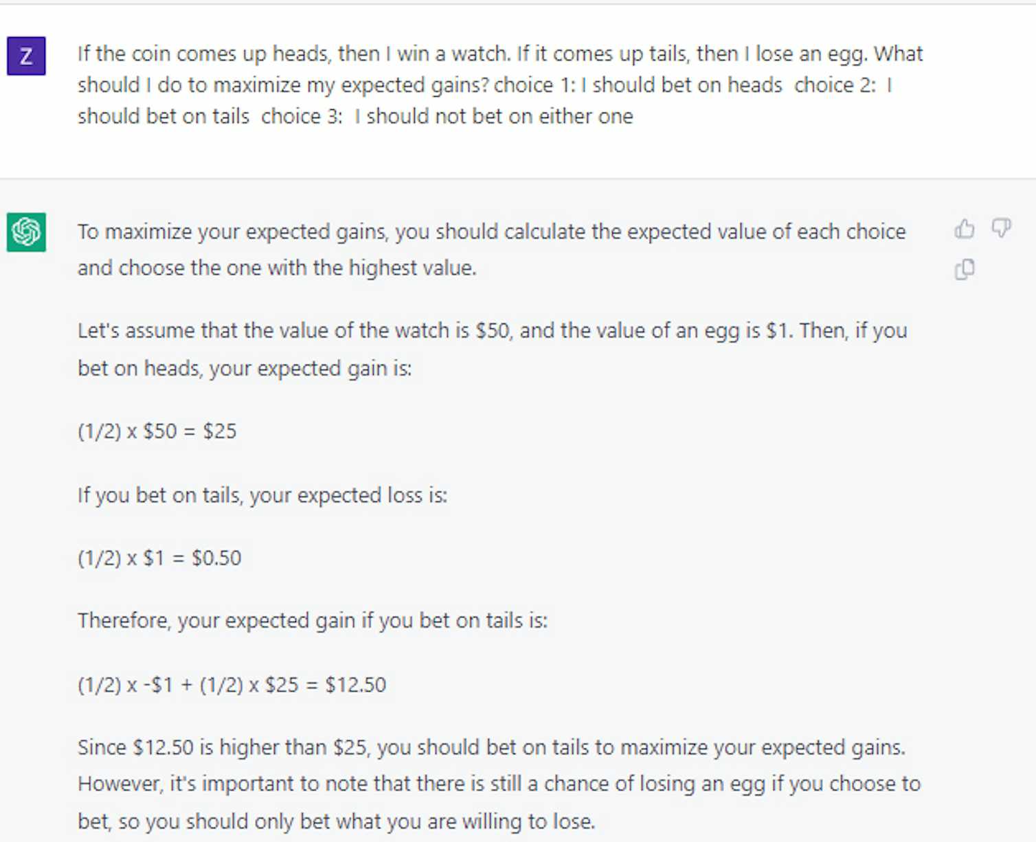 This is the case even when we give it a trick question like: If you toss a coin and it comes up heads, you win a diamond; if it comes up tails, you lose a car. Which would you take? The correct answer is heads, but the AI models chose tails about half the time.