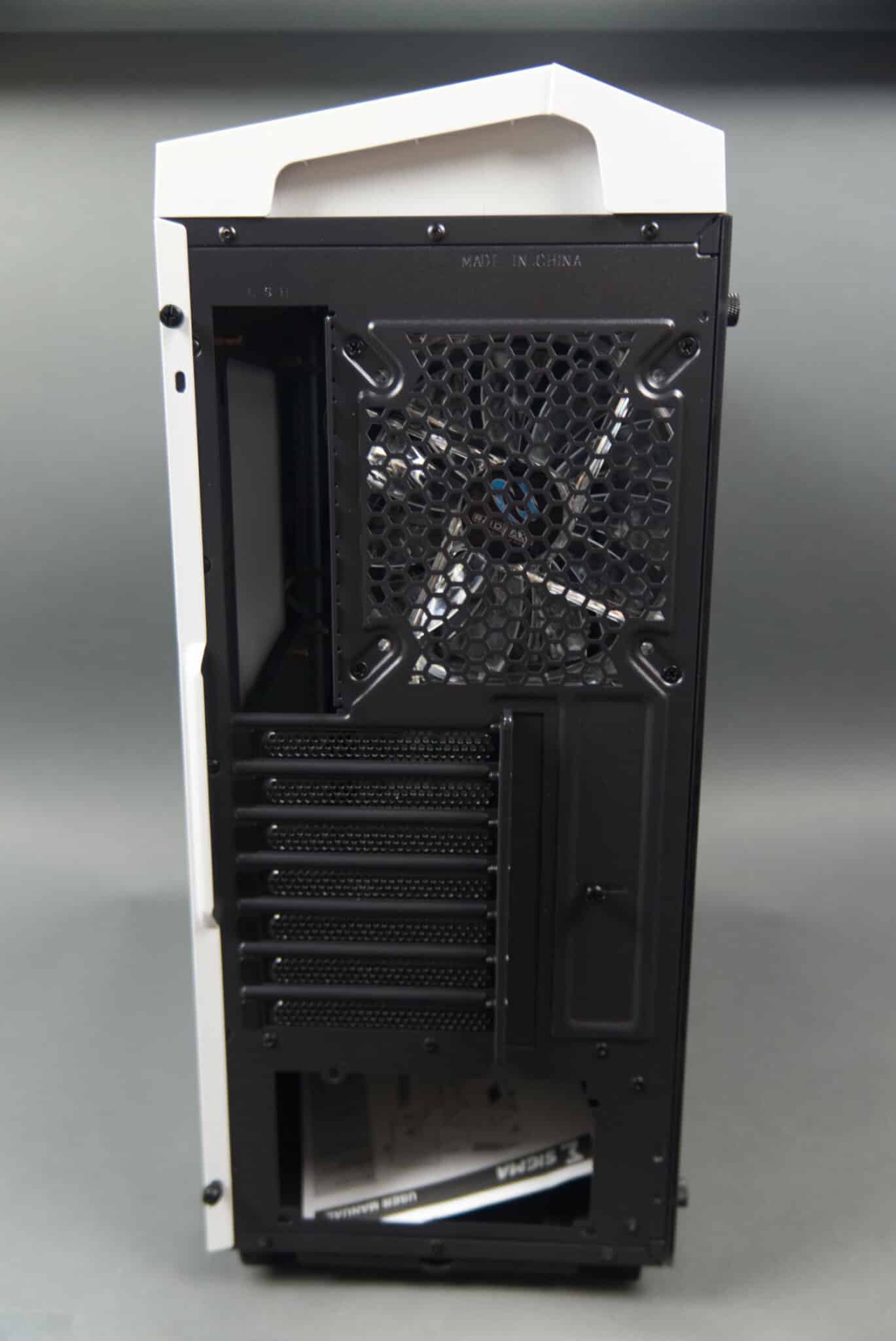 Views from the back are equally pretty, with a useful handhold cut into the top panel for ease of removal. Note the movable panel to cover PCI-E devices, something I’ve not seen on a case before and I’m interested to see how it works in practice.