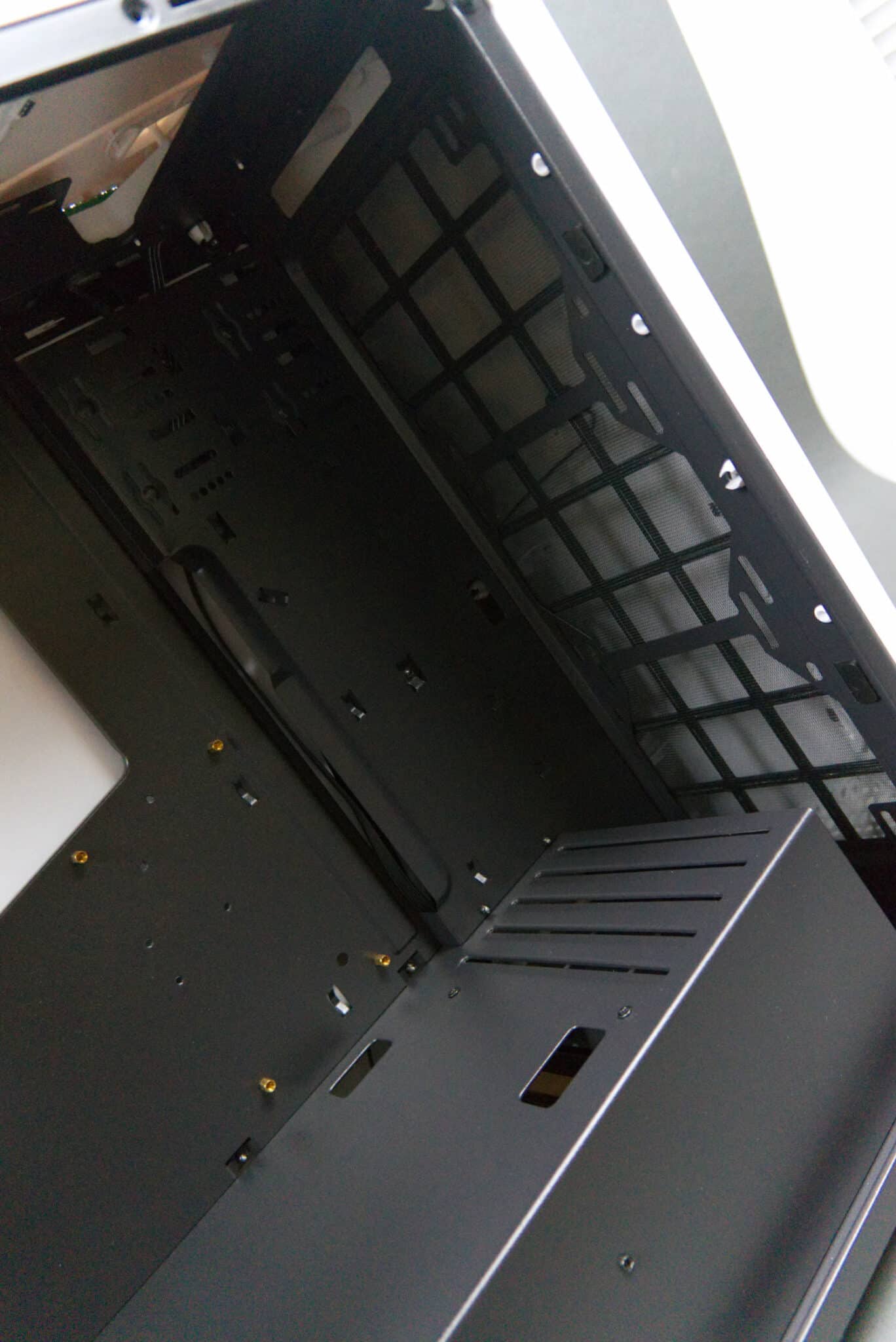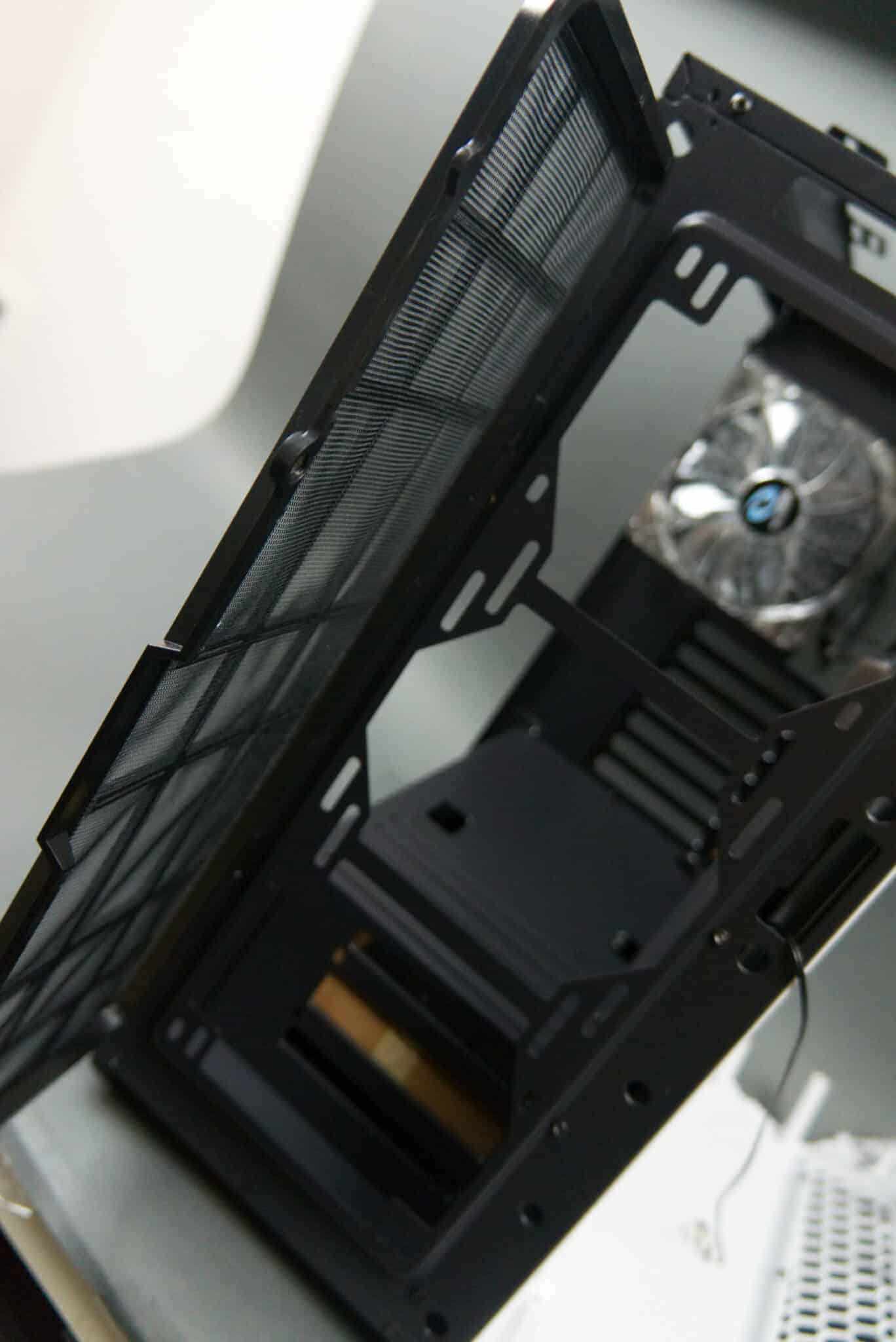 Moving around the inside of the case, there is space for a 360mm radiator on the front, with a magnet-mounted, removable dust filter. There’s also plenty of grommet holes for cable management and space for magnetic LED strips which securely attach to the metal of the case is fairly thick. There’s a Skyway for easy cable management for the 24-pin or other cables going to the motherboard, several holes in the top of the PSU compartment for Audio/GPU/Front panel connectors to pass through, and a vented area so your HDDs don’t sit in stagnating warm air. This is a nice touch, with how cramped PSU shrouds usually get it’s nice to see some thought put into thermals. There’s space for 120 and 140 size fans or radiators in the top. I had a small clearance issue putting my Swiftech H240X into the top; this might be because of its non-standard layout so ended up using an air cooler later on.
