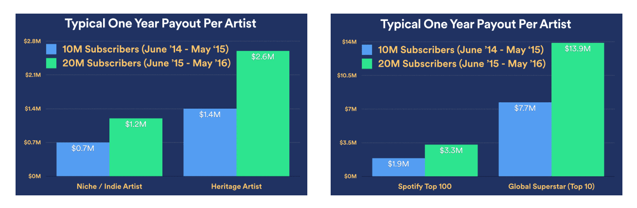 In a recent blog post on the company’s blog, Spotify provided the charts below showing actual payouts to four different types of artists: